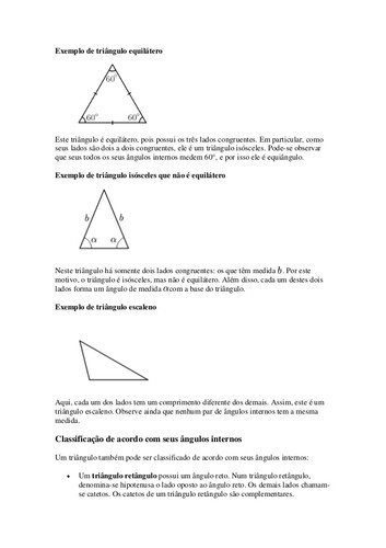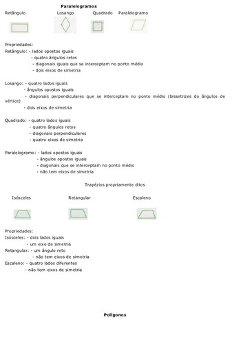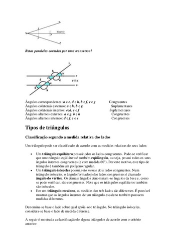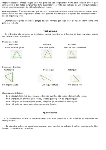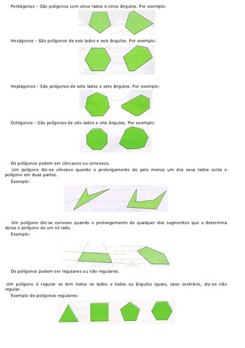 A Geometria está apoiada sobre alguns postulados, axiomas, definições e teoremas, sendo que essas definições e postulados são usados para demonstrar a validade de cada teorema. Alguns desses objetos são aceitos sem demonstração, isto é, você deve aceitar tais conceitos porque os mesmos parecem funcionar na prática!A Geometria permite que façamos uso dos conceitos elementares para construir outros objetos mais complexos como: pontos especiais, retas especiais, planos dos mais variados tipos, ângulos, médias,centros de gravidade de objetos, etc.Algumas definições Polígono: É uma figura plana formada por três ou mais segmentos chamados lados de modo que cadalado tem interseção com somente outros dois lados próximos, sendo que tais interseções são denominadas vértices do polígono e os lados próximos não são paralelos.
