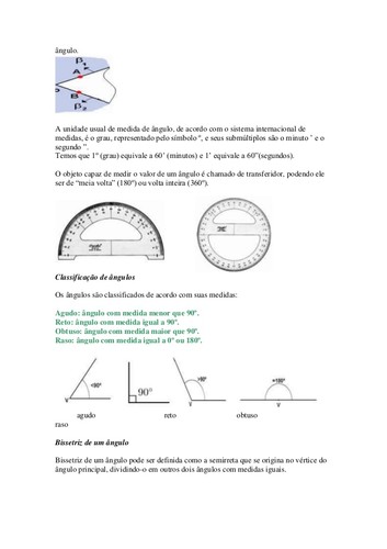Geometria Plana Princípios básicos de Geometria Plana. Os estudos iniciais sobre Geometria Plana estão relacionados à Grécia Antiga, também pode ser denominada Geometria Euclidiana em homenagem a Euclides de Alexandria (360 a.C. - 295 a.C.), grande matemático educado na cidade de Atenas e frequentador da escola fundamentada nos princípios de Platão. Os princípios que levaram à elaboração da Geometria Euclidiana eram baseados nos estudos do ponto, da reta e do plano. O ponto era considerado um elemento que não tinha definição plausível, a reta era definida como uma sequência infinita de pontos e o plano definido através da disposição de retas. As definições teóricas da Geometria de Euclides estão baseadas em axiomas, postulados, definições e teoremas que estruturam a construção de variadas formas planas. Os polígonos são representações planas que possuem definições, propriedades e elementos. Podemos relacionar à Geometria plana os seguintes conteúdos programáticos: Ponto, reta e plano Posições relativas entre retas Ângulos Triângulos Quadriláteros Polígonos Perímetro Áreas de regiões planas Ângulos Denominamos ângulo a região do plano limitada por duas semirretas de mesma origem.